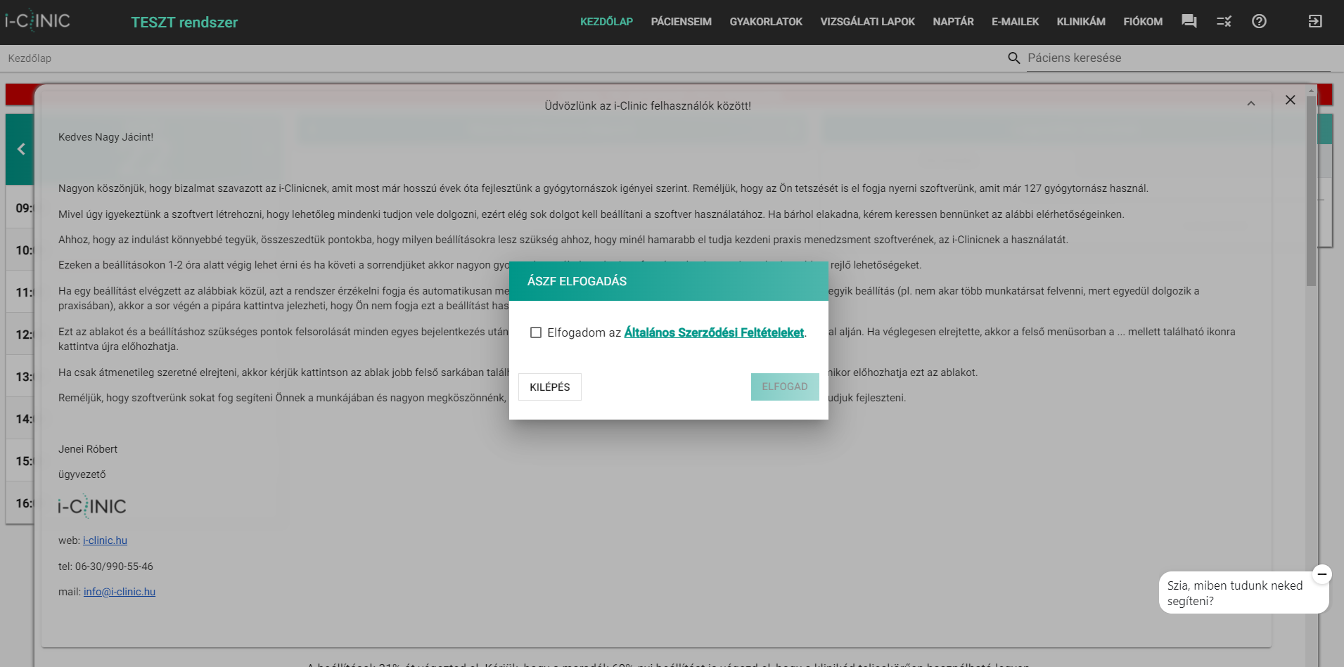 Ezek közül az első az a Felhasználási Feltételeinket részletesen szabályozó dokumentum megosztása és elfogadása, ami később az előfizetői szolgáltatásunkat is szabályozza majd. Ez minden klinika admin számára az első belépést követően megjelent egy popupban, ahol ha rákattintott a Felhasználási feltételek linkre, el tudta olvasni a részletes dokumentumot, valamint ebben a felugró ablakban volt lehetőség ennek elfogadására is.