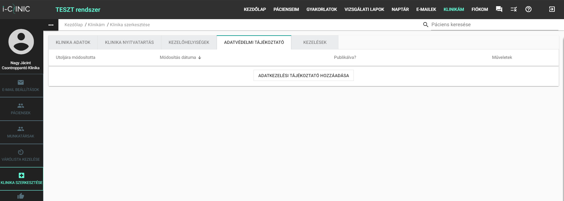A klinika adminisztrátorai a Klinikám/Klinika szerkesztése menüpontot megnyitva az Adatvédelmi tájékoztató fület kiválasztva tudják létrehozni/hozzáadni az általunk megosztott Adatvédelmi tájékoztató mintát. Ehhez az „Adatvédelmi tájékoztató hozzáadása” gombra kell kattintani.