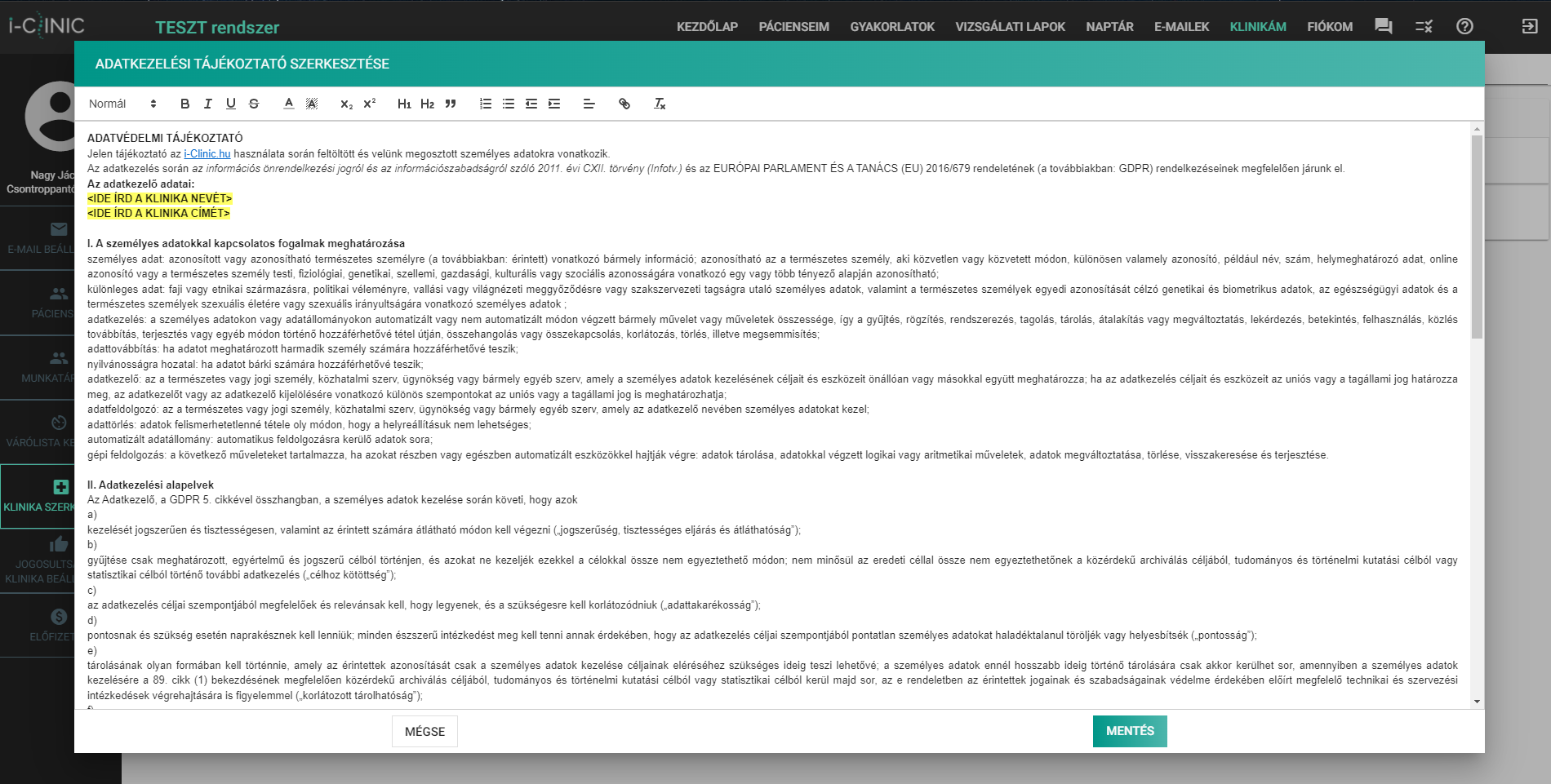 Ekkor fel fog ugorni az az szerkesztő ablak, ahol az adatvédelmi tájékoztató szövegét lehet beszerkeszteni, ez fogja tartalmazni a mintát. Értelemszerűen mivel ez csak egy minta, így ennek használatához elengedhetetlen, hogy a Klinika neve és Klinika adatai rész kitöltésre kerüljenek.