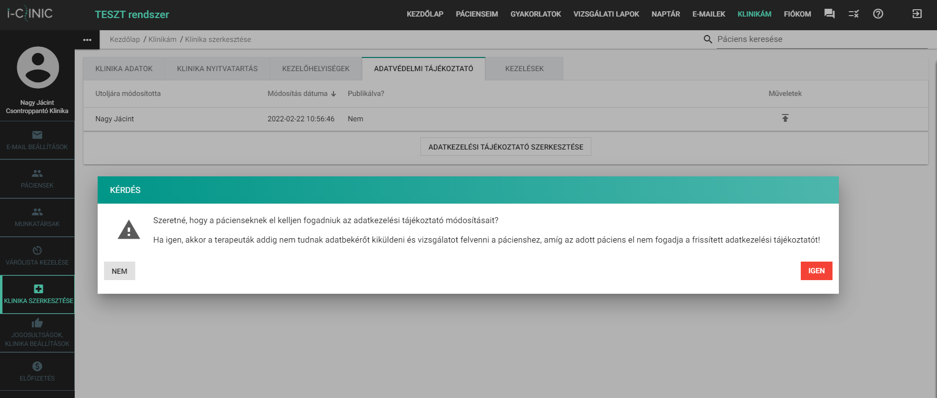 A mentés gombra kattintva még csak maga a szöveg vagy annak módosítása kerül elmentésre, ez még nem fog automatikusan megjelenni a pácienseknek! Ha a mentés után a Műveletek oszlopbantalálható publikálás ikonra kattintunk, válik elérhető a páciensek számára is. A publikálásra kattintva egy felugró ablakban először meg kell erősítenünk, hogy valóban végeztünk a szerkesztéssel. Majd egy második ablakban döntenünk kell arról, hogy a létrehozott/módosított adatkezelési tájékoztatót el szeretnénk-e fogadtatni külön a páciensekkel is? Ha itt az igenre kattintunk, az azt jelenti, hogy amíg a páciensek nem fogadták el, addig nem lehet hozzájuk új adatokat, vizsgálatot felvenni!