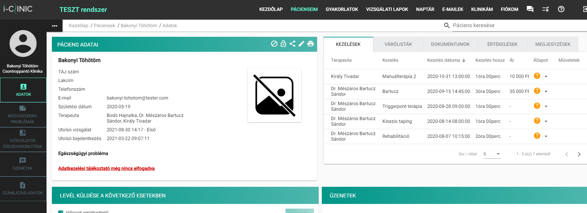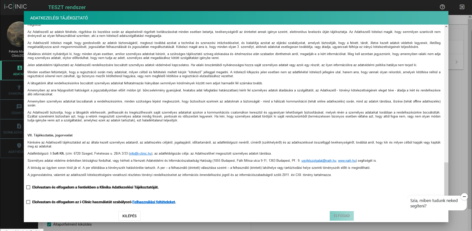 - Ha a páciens be tud lépni a saját felhasználói fiókjába, akkor a belépést követően egyből fel fog ugorni neki egy ablak az Adatvédelmit tájékoztató szövegével, valamint az alján az i-Clinic használatát szabályozó felhasználási feltételekkel. Ezt ő ebben a popupban tudja elfogadni és csak ezt követően mehet tovább a saját fiókjában bármely egyéb menüpontra, funkcióra.